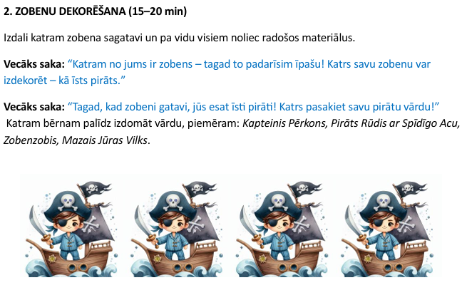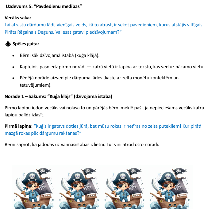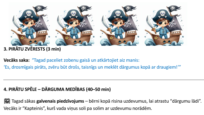 Piedaloties aizraujošajā pirātu spēlē "Dārguma medības", bērni kopīgi risina uzdevumus, pārvar šķēršļus un meklē pavedienus, kas ved pie noslēpumainā dārguma lādes. Spēles laikā viņi attīsta sadarbību, drosmi un radošumu, iejūtoties īstu pirātu lomā. Noslēgumā bērnus gaida atraduma prieks, kopīgs dārguma dalīšanas mirklis un jautras atmiņas par lielisko piedzīvojumu!